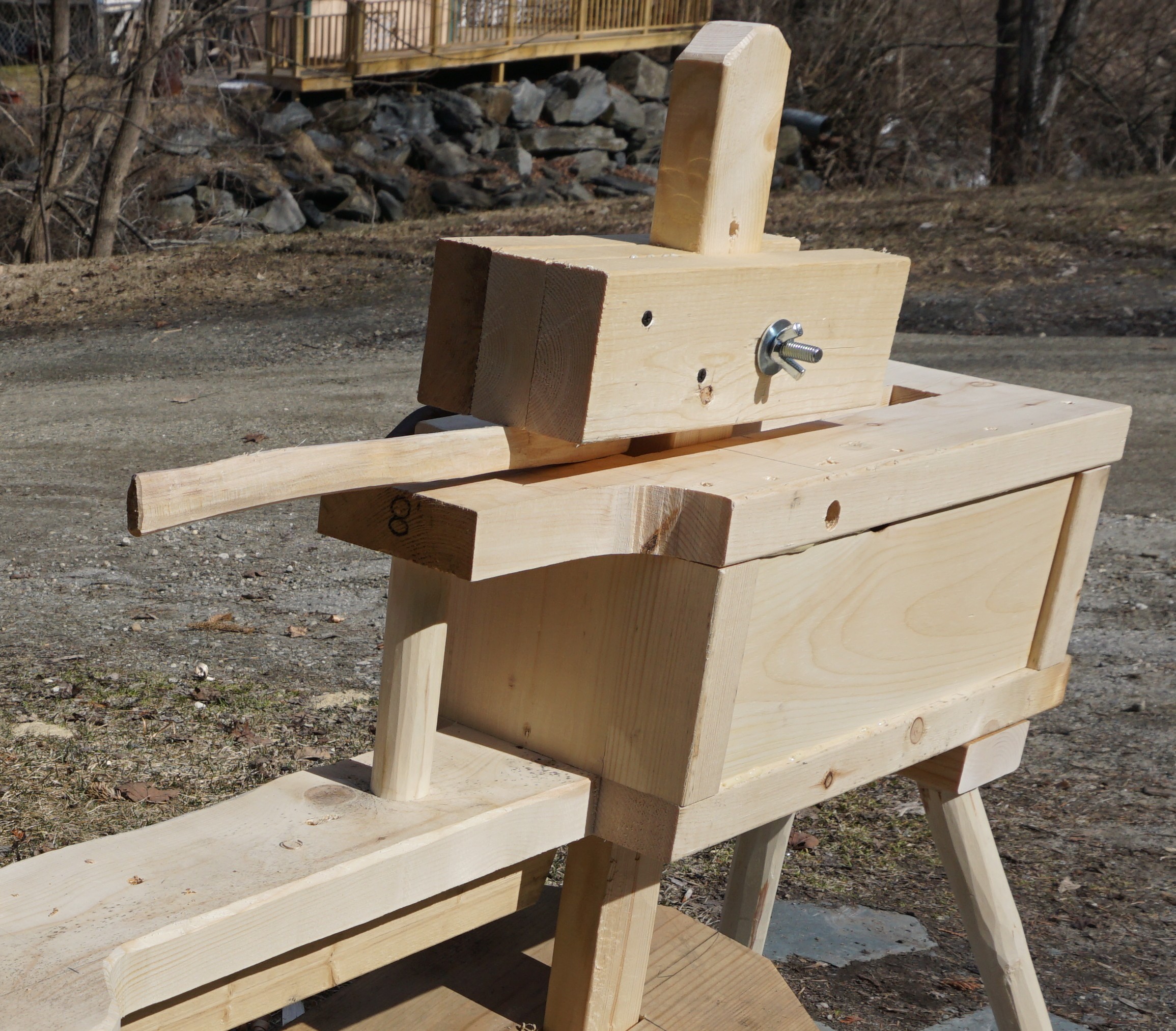 It’s made up of one 2x10x8′(half of it making up the 4′ bench, and the rest the top and ends of “the box” section), one 2x3x8′(half for the pivoting “stem” part to which the foot pedal and the clamping head connect, and half for the long support piece under the seat reducing flex of the narrow middle of the bench), about half of a 2x4x8′(the two blocks under the bench ends that the legs pass through, and the rest for the clamping head), and about half of a 1x10x8′ #2 pine(making up the two sides of “the box” section). I used a scrap of 2×12 pt for the foot pedal, and 1″ hardwood dowel from a paint roller extension handle to peg underneath it and make the foot pedal adjustable up and down the “stem”. I found the steel rod on which the “stem” pivots at a garage sale years ago. It passes all the way through the top of the 2×10 box, and the bent end makes it easy to remove (This could be replaced with any steel rod, threaded or not). There is one 5″ bolt with two washers and a wingnut holding the head on, which is also adjustable up and down the stem so that the opening of the clamping space can be made bigger or smaller.