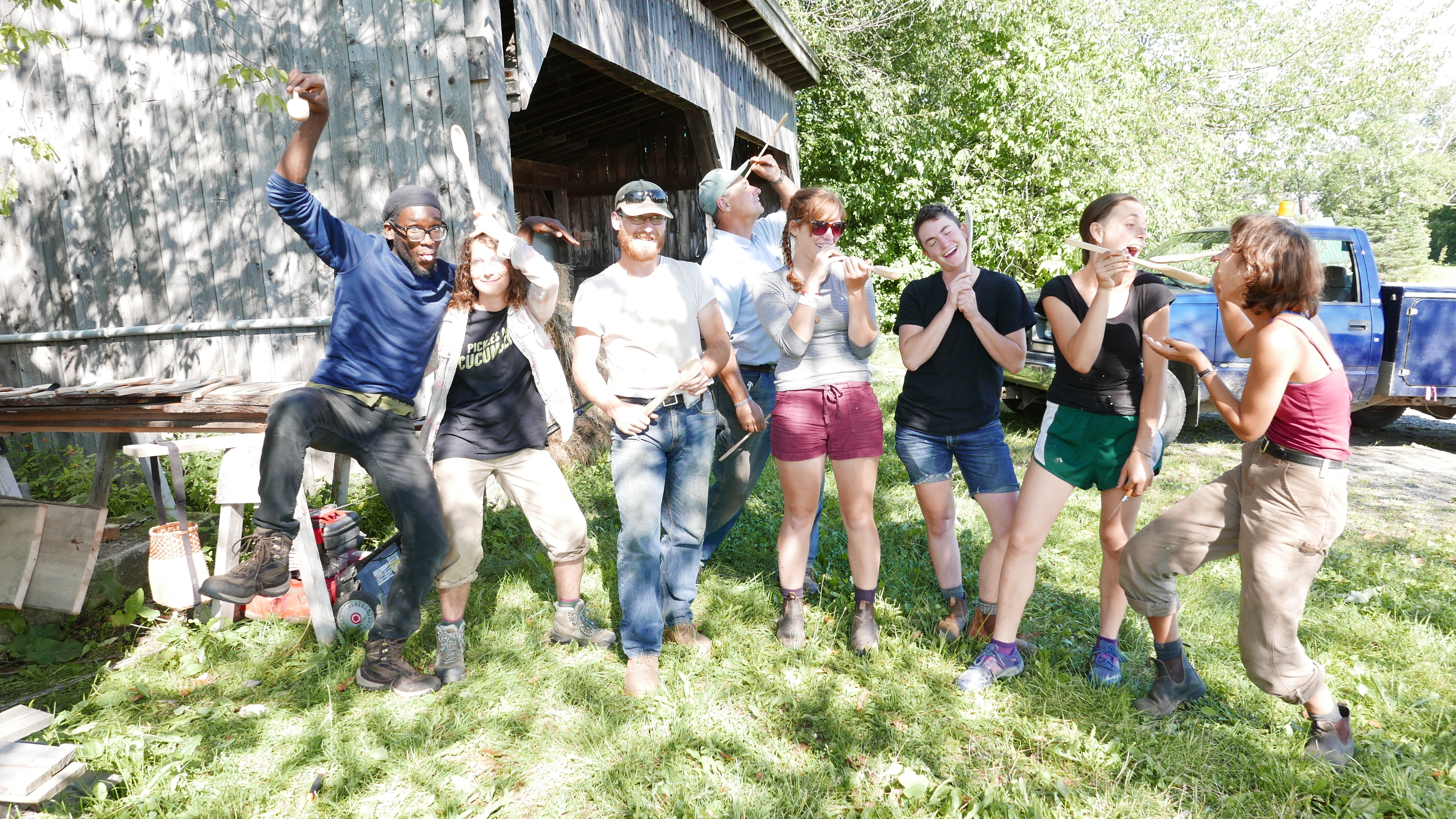Well if you know me, you wouldn’t have to twist my arm to get me to drive out to Craftsbury, VT, blasting The Duhks along the way through a sparkling August day to carve spoons together with a group of spry young people who signed up for such a program. Not to mention the delicious lunch, much of which came right from the Sterling farm. Oh, and there was the modest timber-framed green-woodworking building perched atop a hill amongst a few outbuildings, the lower half of which infilled with cordwood masonry, sporting wide views of the working farm, barns, and hills beyond seemingly intentionally spread out before it. Oh, also, there was the great and cheerful company of Rick Thomas, who in the span of the afternoon espoused so much knowledge to me as we walked the land that I had to pull over on the way home to take notes from my overflowing brain before the important stuff, like preparing the land for fruit trees, or clearing the ground beneath a favored variety of tree particularly loaded with seed to receive and start new trees, was lost to me on my drive home.