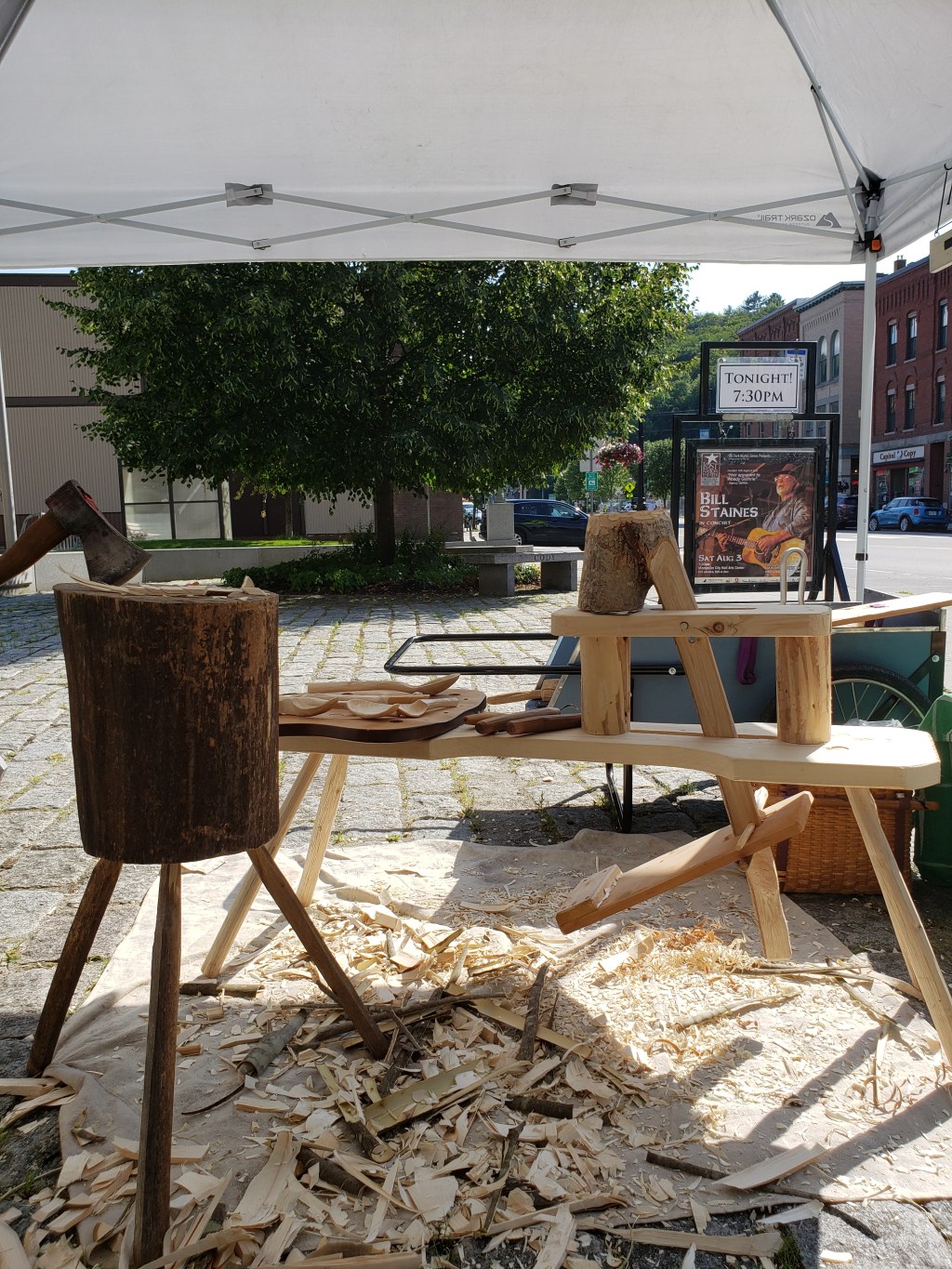 Typically, throughout the summer and fall, you may find me regularly making spoons at my cart at City Hall Plaza in Montpelier, VT. This year, due to the global pandemic, I have been weighing the safety of working out on the plaza. Recently I spent the day on the Plaza making spoons to test my ability to keep the space safe, work with a mask on, and to figure out how to let customers check out the spoons for sale without handling them. It was a bit challenging. I do anticipate heading out to the Plaza again in August, September, and October of 2020 on a limited basis. If you do see me there, please stop in and follow Vermont’s mask wearing mandate and social distancing recommendation of 6 feet between persons.