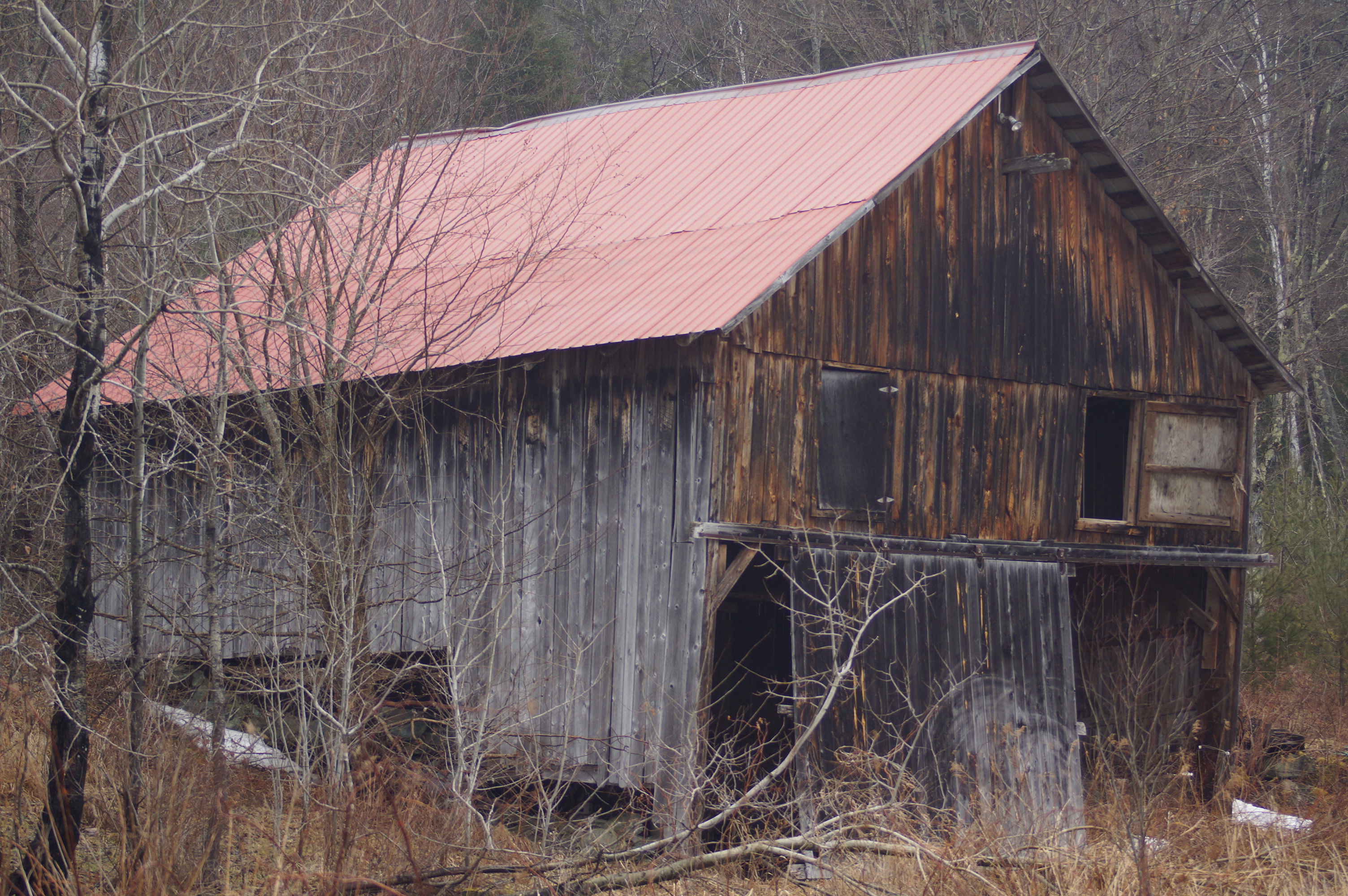 Today I worked from home and, because the office is still a pencil-eraser-sized camera wherever you are, at lunch I walked our dog down in the woods to the logging tarp-shack for lunch.