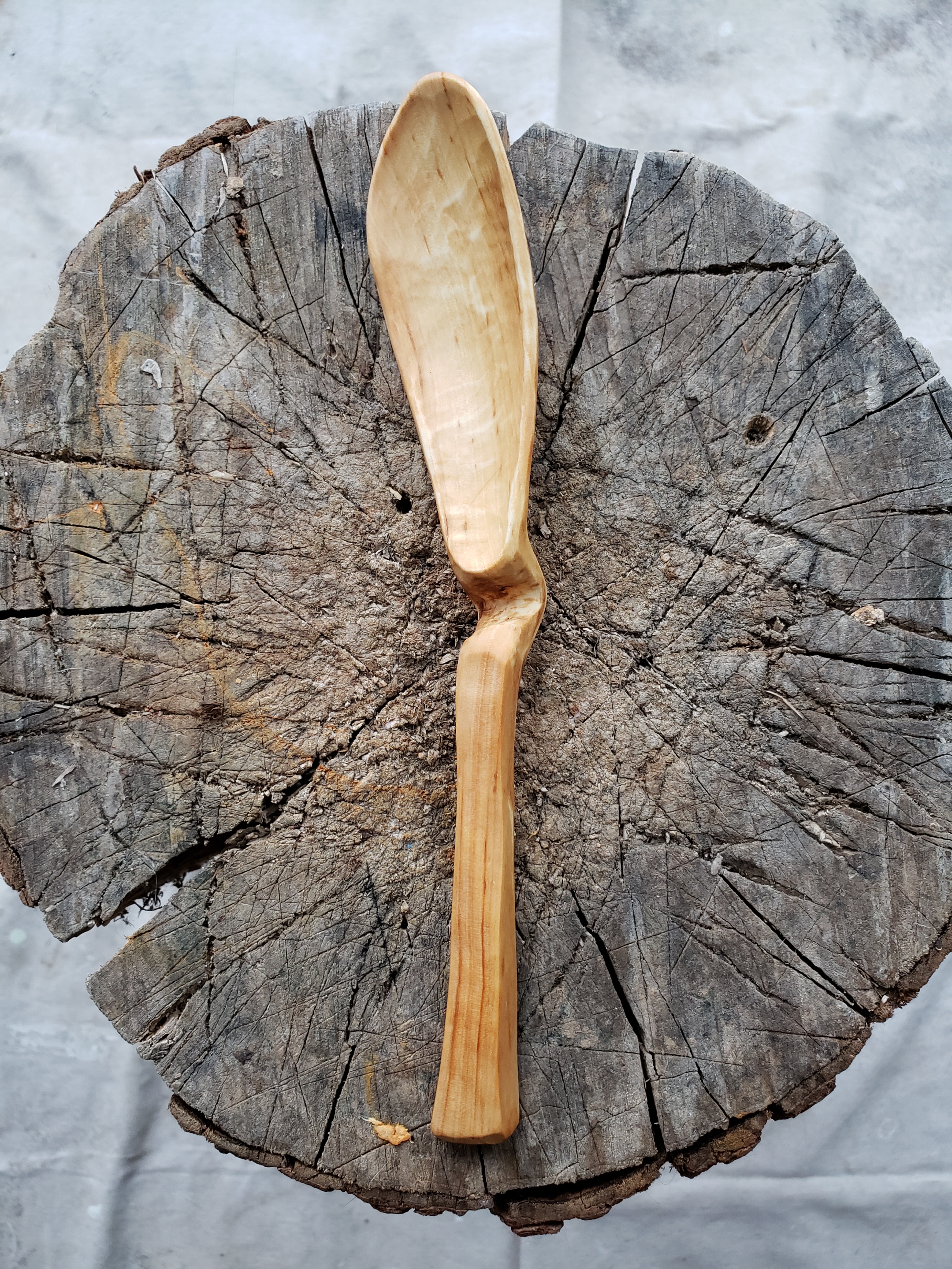 It is such a gift to find something to do that you love, and for nearly 30 years now I’ve been making wooden spoons and other utensils from green wood. For me, usually, there are only three simple tools involved. A hatchet, a knife, and a bent knife. These tools are small, easy to carry and to care for, and require no electricity. One set of them could last you close to a lifetime. As with any craft, there are literally hundreds of choices of tools, and dozens of ways to shape wood into a spoon. I’ve tried many tools and many ways. Making a spoon is a really nice project because you create something from start to finish in fairly short order, and get a wonderful sense of satisfaction. Then, you have a spoon. Everyone needs a spoon. You give them away or sell them, and they are gone, and because they are useful material objects made of wood, they are somewhat ephemeral. Every spoon you make teaches you something new. Every piece of wood is different, so there is always a sense of exploration and unknown. You learn how to take care of your tools. There is a rhythm.